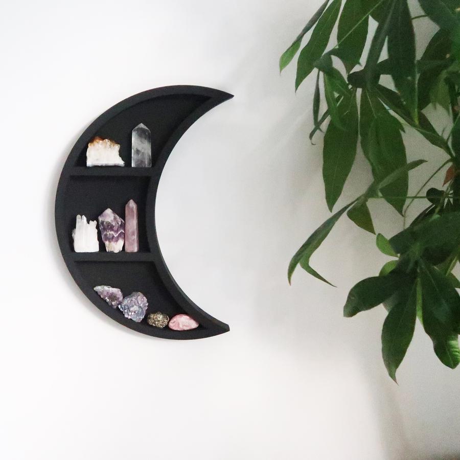 A piece of moon magic to house and display your crystals and keepsakes. Made out of poplar wood and stained in choice of either a matt black colour or a dark brown colour.