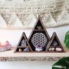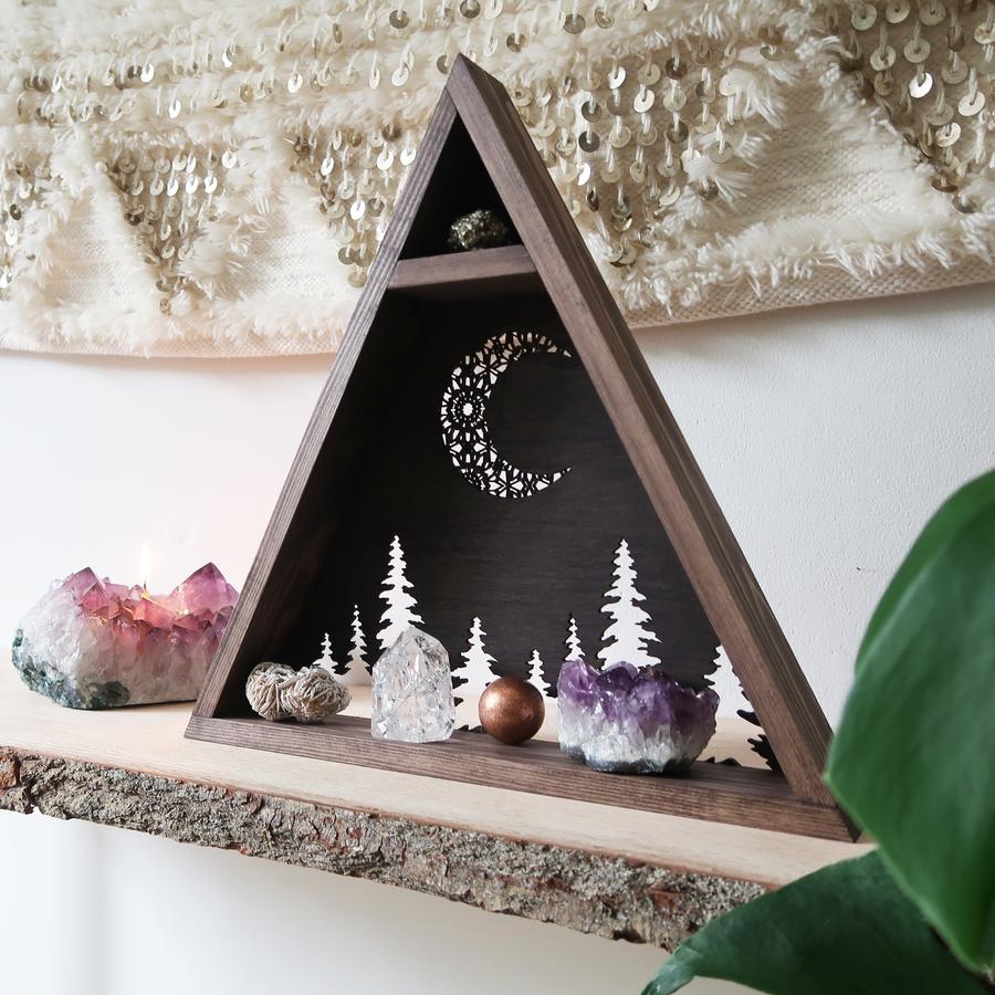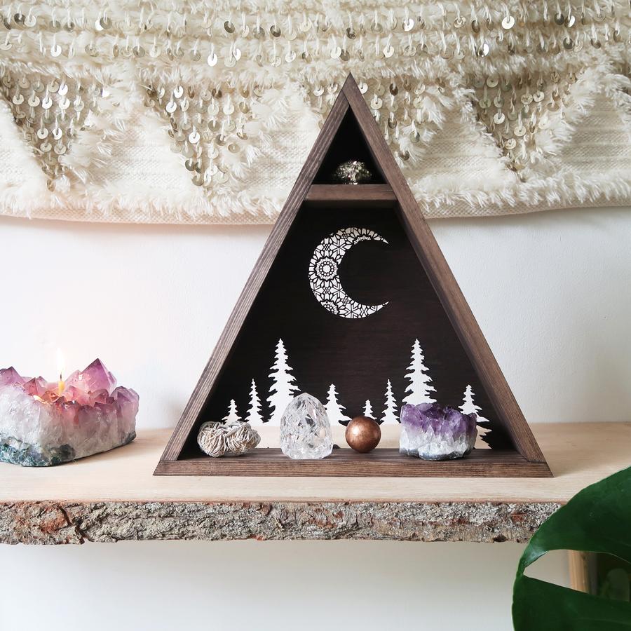 Wooden triangle mandala moon shelf, this unique wooden shelf is perfect for storing your crystals and keepsakes. Made from solid pine and stained in a dark oak colour with a beautiful Mandala designed moon cut into the back and forest cut out too!