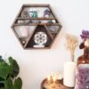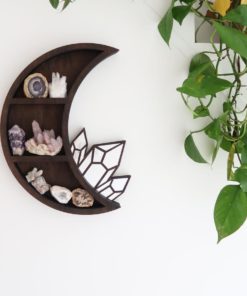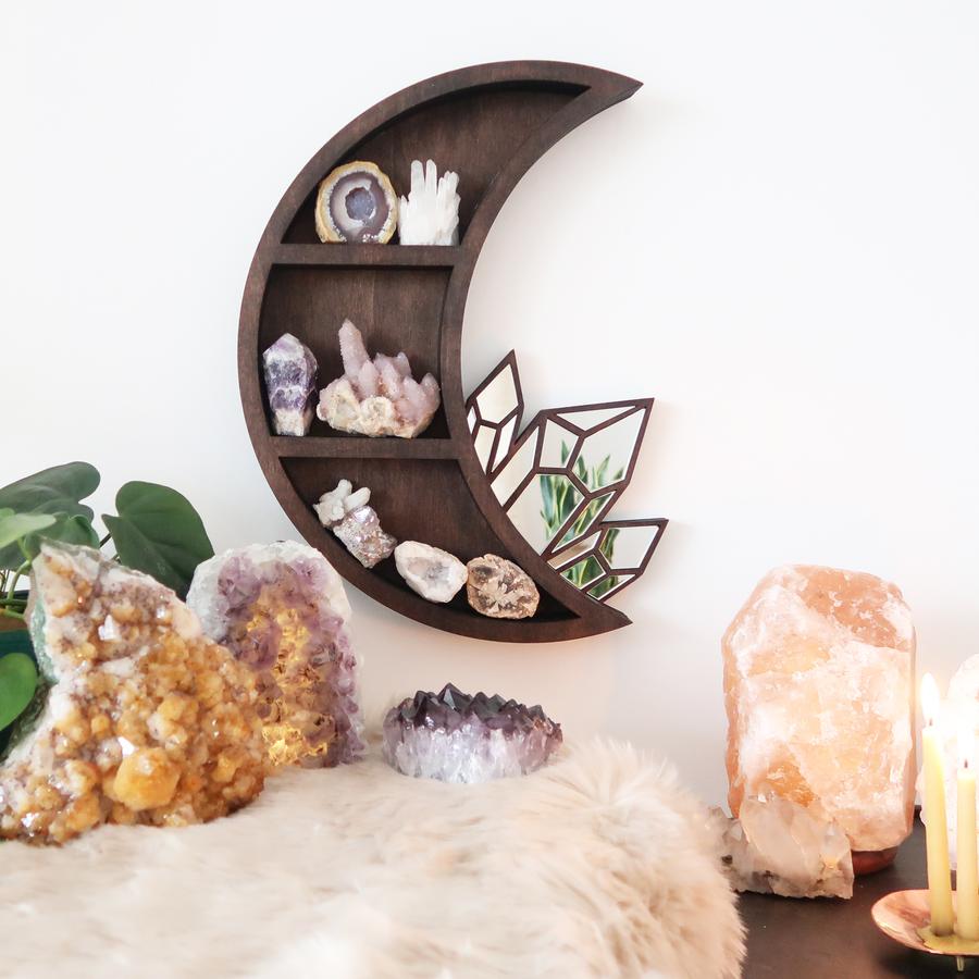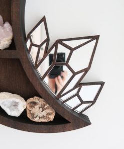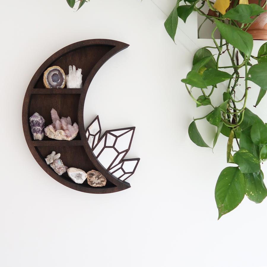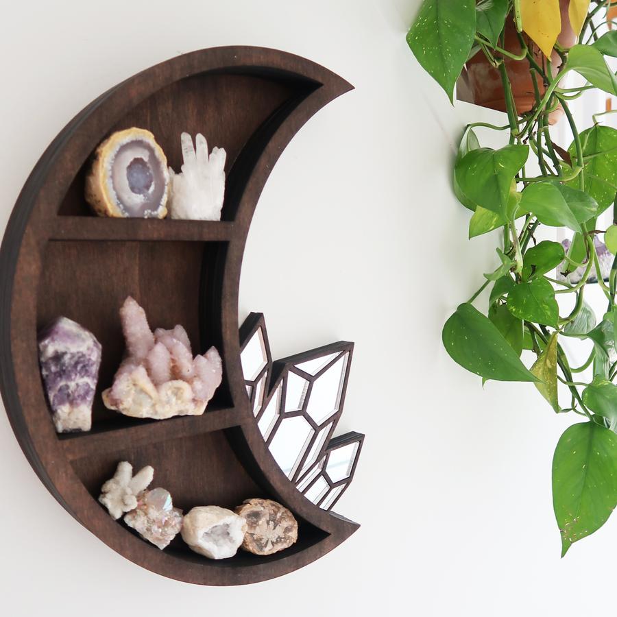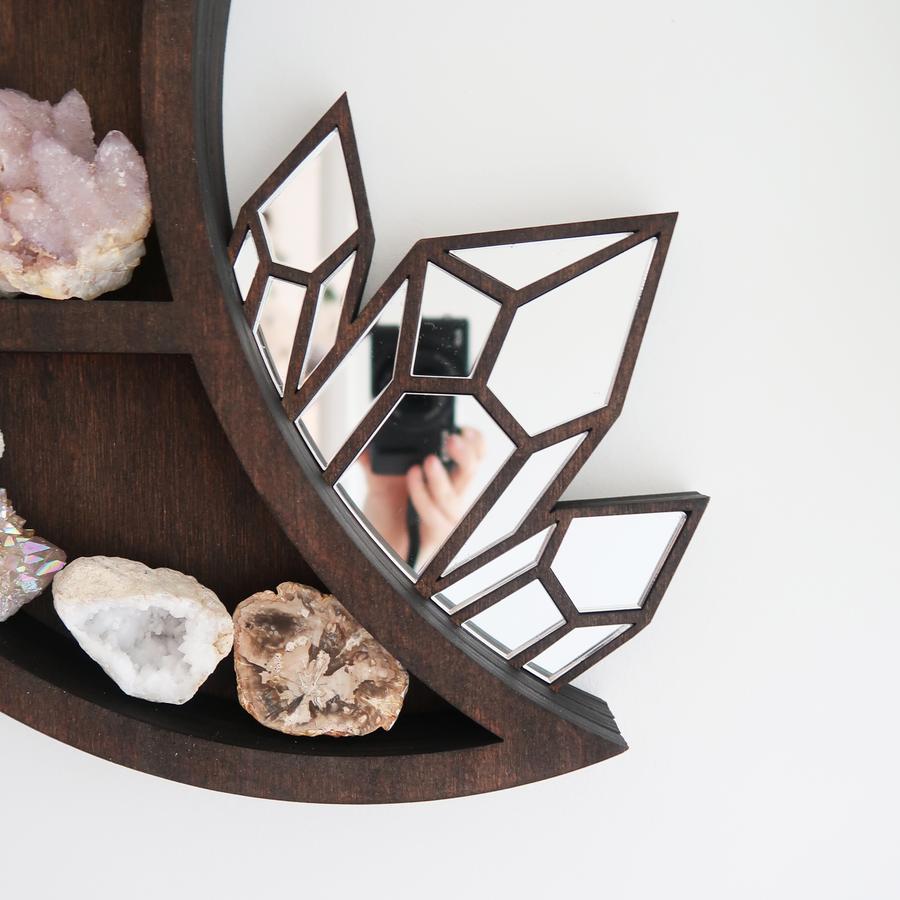 Large crescent moon shelf with a crystal cluster mirror protruding out of the top! Made out of poplar wood and stained in either a brown or a matt black colour