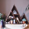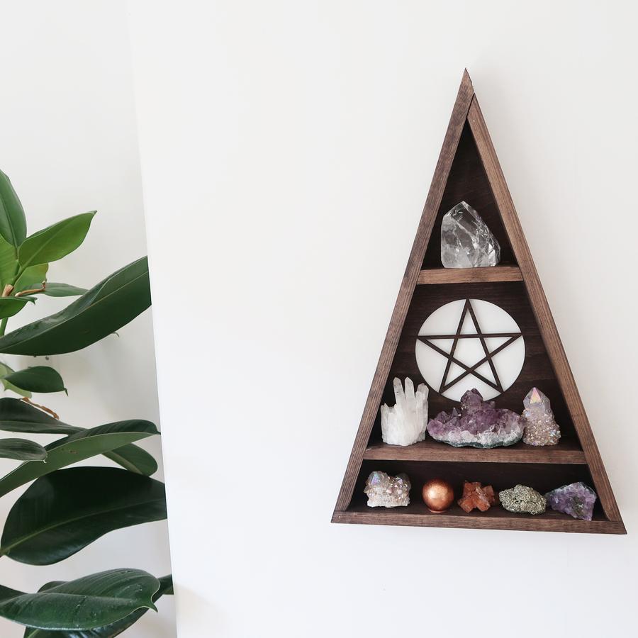 A beautifully handmade shelf which has cut out pentagram at the back and has been designed to store and display your crystals or keepsakes. Made from solid Pine and stained in a dark oak colour.