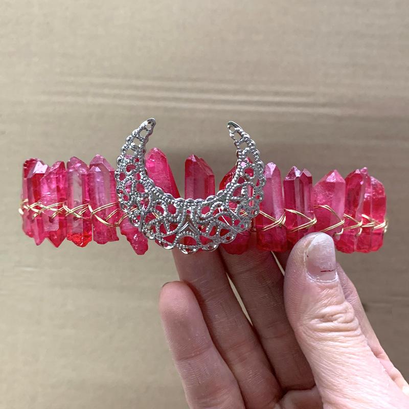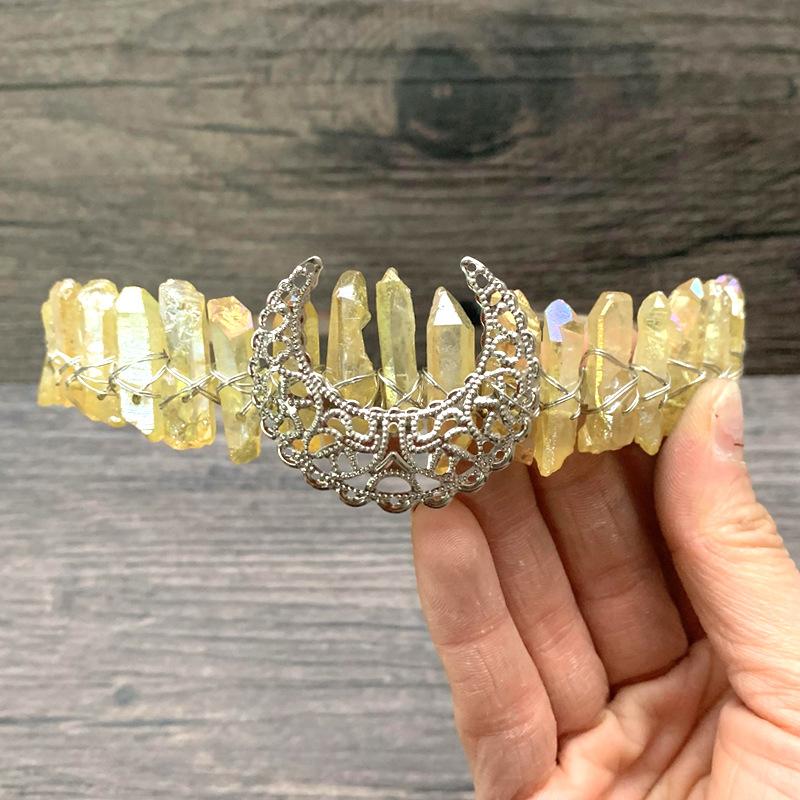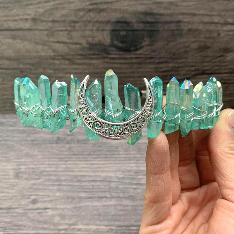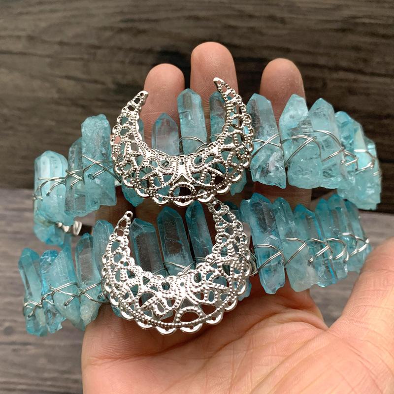Feel and look like a fairy princess with a beautiful raw angel aura quartz crystal headband. Handmade with beautiful raw angel aura quartz crystals and silver wire to create a one of kind quartz crystal headband perfect for any occasion! Angel Aura Quartz is used to increase the wearers overall mood and energy!
